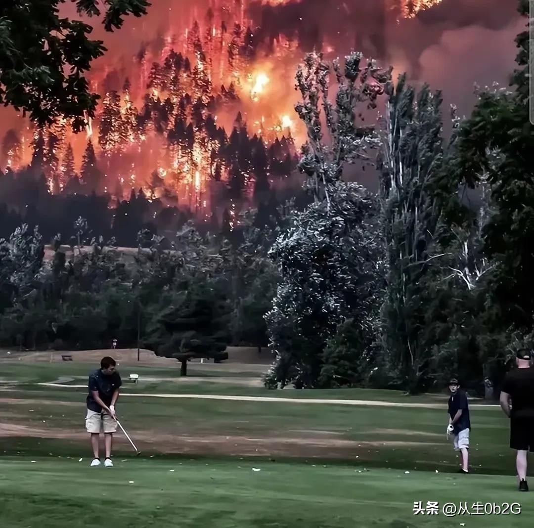 最后,让我们目睹一幅远处山火肆虐,消防员们正奋力扑灭火势,而山脚下的有钱人却在悠闲地打着高尔夫球,反差鲜明地展现了社会中的不公与人性的冷漠。