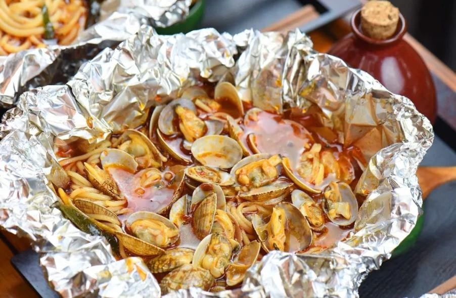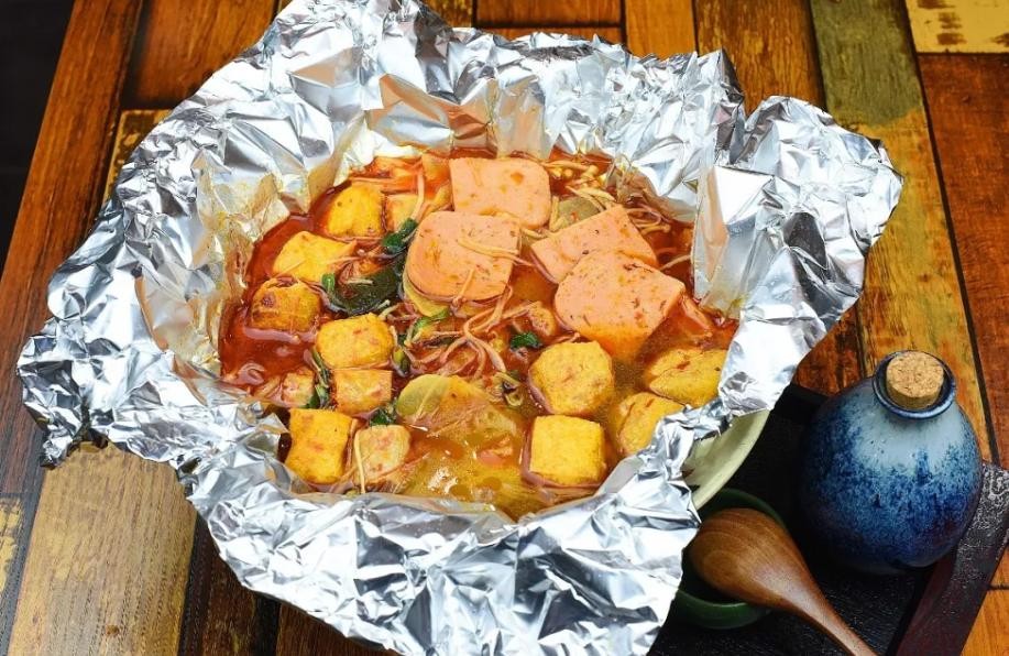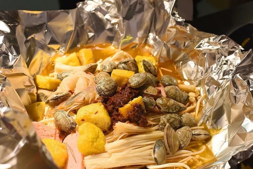 锡纸包裹鲜虾、午餐肉、花甲、金针菇、油豆腐等食材搭配秘制的酱料小火炖煮几分钟,入味后足以惊艳挑剔味蕾,对于有选择困难症的小伙伴来说包烧大杂烩实在是最佳选择,没有之一。