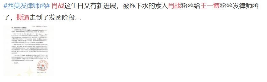 而日,前一天王一博才刚刚给肖战开开心心微博庆生,后一天肖战粉丝就因为遭遇网络暴力而给一位王一博粉丝发了律师函,随后两家粉丝大战,直接撕上了热搜。