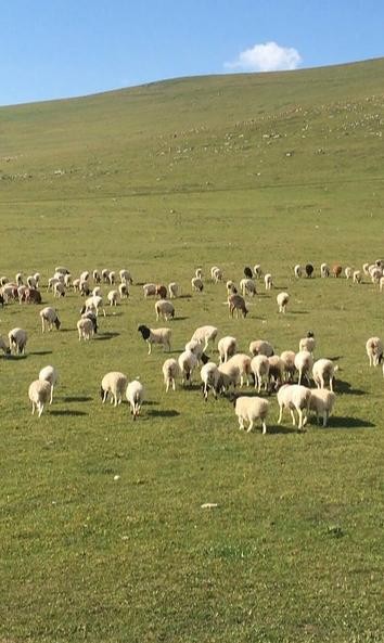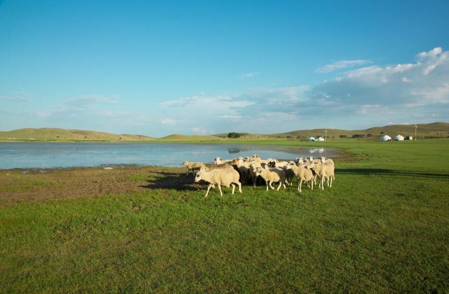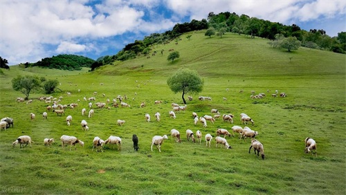 蓝天白云的交相辉映下,可以看到羊群悠闲地漫步,为这草原增添了一份生机。