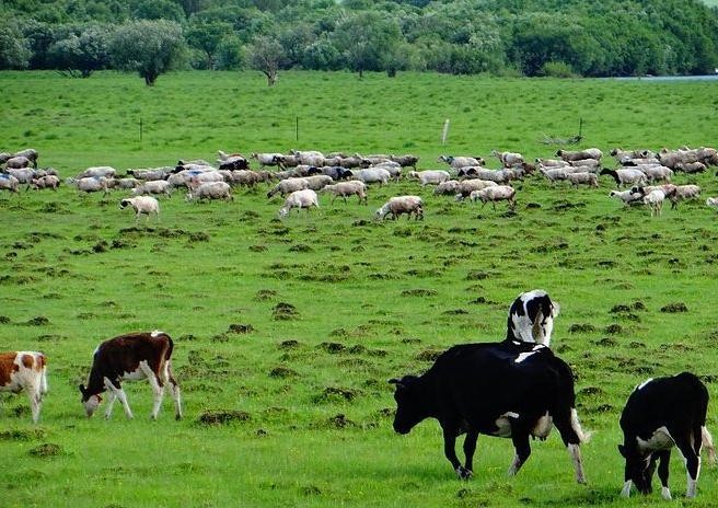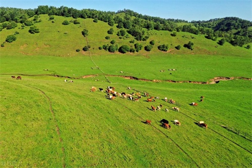 牛羊成群,悠扬的牧歌从远方飘来,给这幅寂静的“画”增添了一丝丝的生机。清晨,当第一缕阳光洒在这偌大的草原上,金色的光芒与翠绿的草地交相辉映,美不胜收。