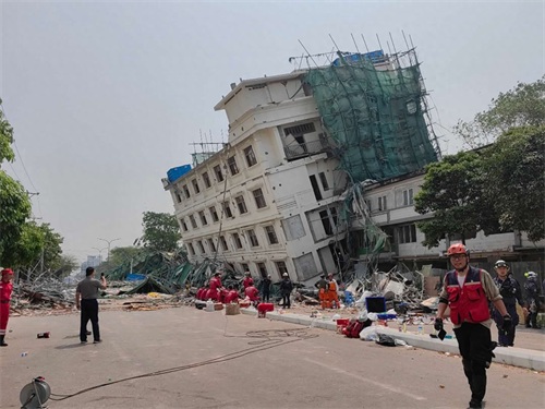 4月1日,潇湘晨报记者随同救援队人员来到一所在装修的酒店公寓楼,目前该8层酒店因缅甸7.9级地震,5层以下化为废墟,没有倒塌的部分也与地面呈30度角倾斜,内部建筑结构被严重破坏,救援难度大。因前一日有救援队在该楼内听到了受困者清晰的敲击。为救出该楼内的受困者,救援队员们目前已不眠不休18个小时。