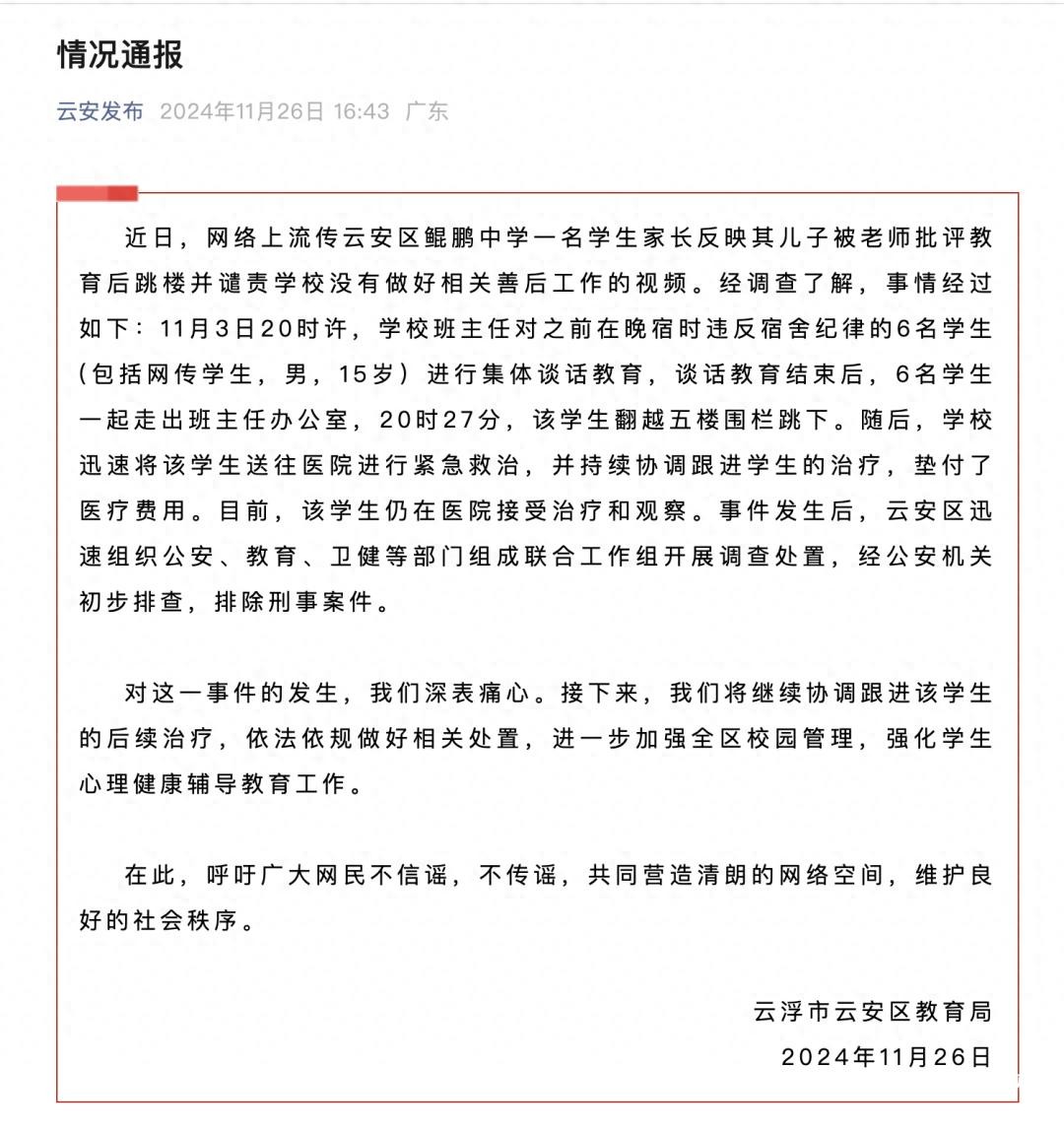 近日,网传广东云浮市云安区鲲鹏中学一名学生被老师批评教育后跳楼。26日,“云安发布”发布情况通报,内容如下: