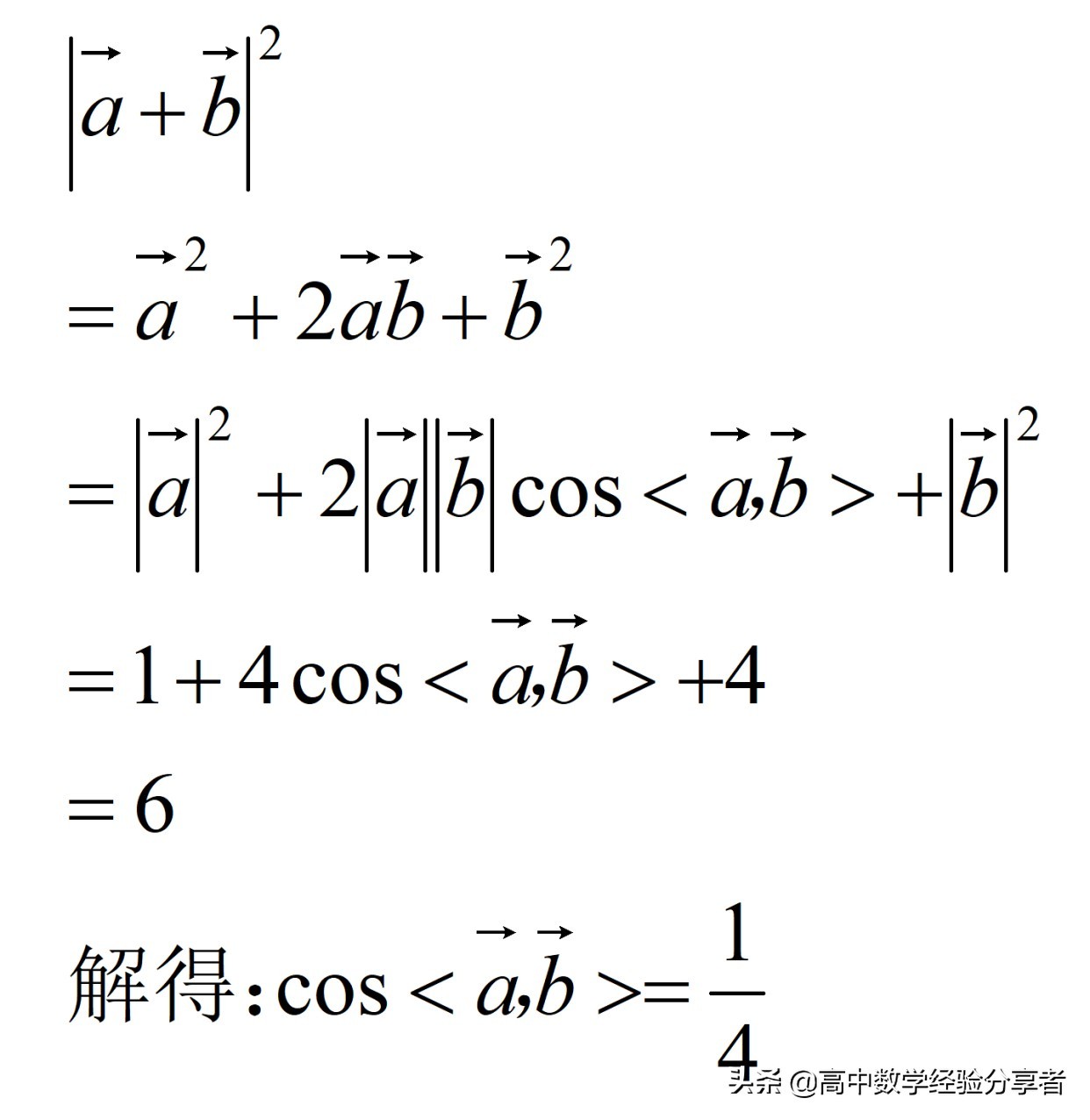 3) 此时已经解得了两个向量的夹角的余弦值是多少,现在已知的条件已经处理完成了,就需要去处理未知,我们需要求解的目标,一个向量的模长,同样采取的方式是平方。