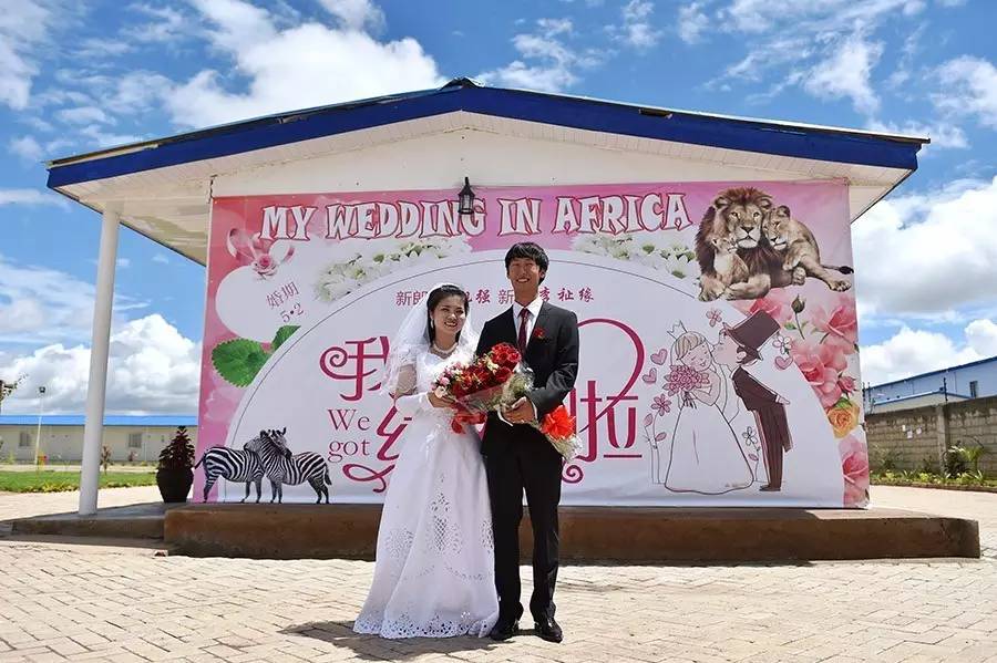 2015年5月2日,90后新人慕旭强(右)和李祉缘在中国路桥工程有限公司承建的蒙巴萨-内罗毕铁路第八项目部营地中肯员工的见证下喜结连理。新郎是子承父业、2012年扎根非洲的北京小伙慕旭强;新娘是留学英国、2014年奔赴非洲的内蒙古女孩李祉缘。他们因参与建设蒙内铁路而相遇、相知,最终步入婚姻殿堂。新华社记者孙瑞博摄