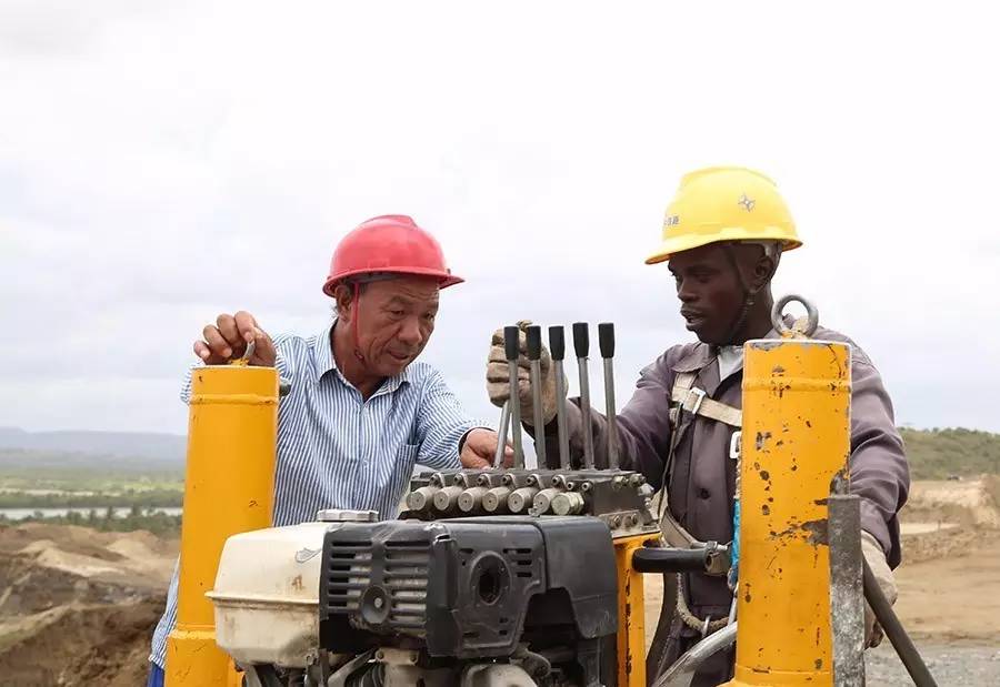2016年9月1日,在肯尼亚蒙巴萨,一名中国工程师在蒙内铁路蒙巴萨特大桥项目现场指导肯方员工操作工程机械。蒙内铁路项目总经理部工作人员说,目前项目进展顺利,已完成总工程量的75%。新华社记者潘思危摄