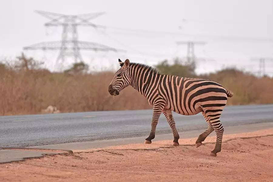 2017年2月22日,在肯尼亚察沃国家公园附近,一只斑马穿过蒙内铁路野生动物通道后试图穿越公路。中国路桥集团一位负责人说,蒙内铁路从设计阶段就把“绿色环保”作为定桥开道、筑路建基的前提和指导原则。新华社记者孙瑞博摄