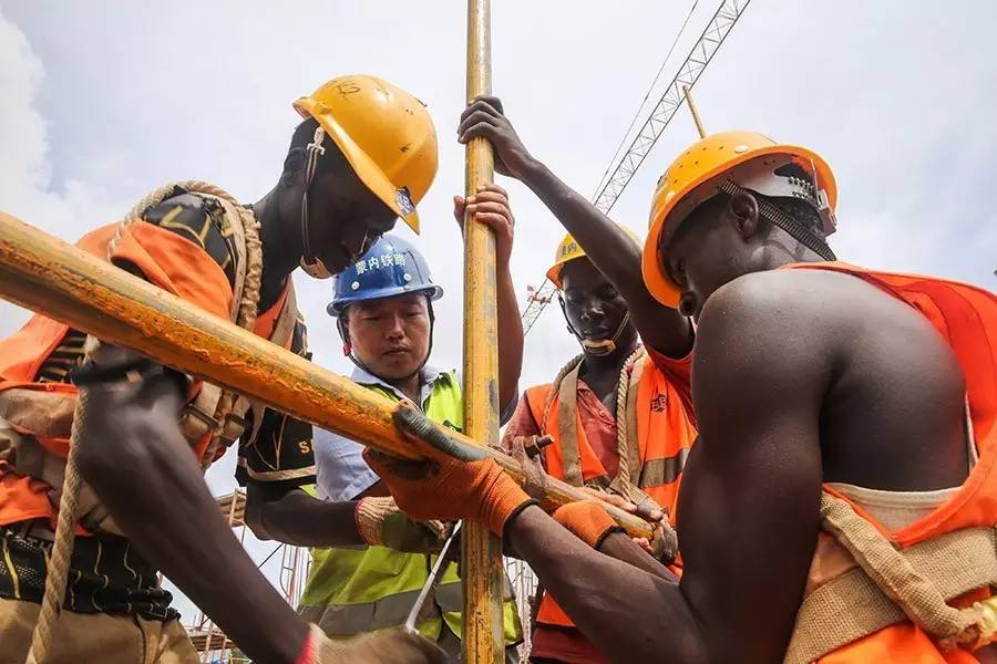 2016年4月9日,在肯尼亚蒙巴萨,中国工程师张青春(左二)和肯方工人们在蒙内铁路蒙巴萨西站工地上工作。新华社记者潘思危摄