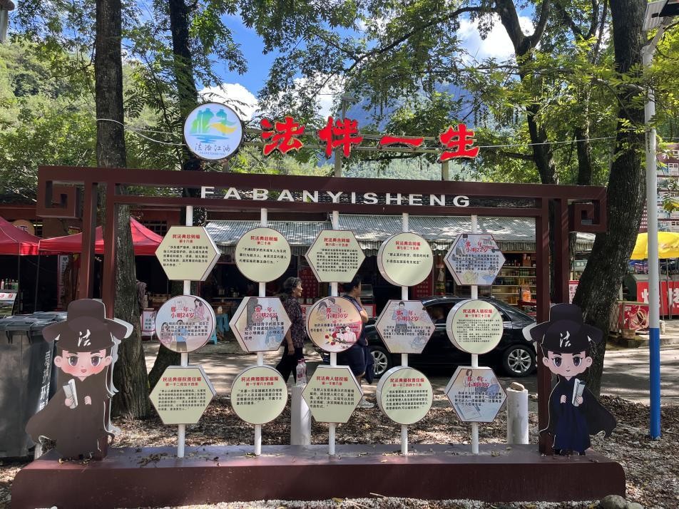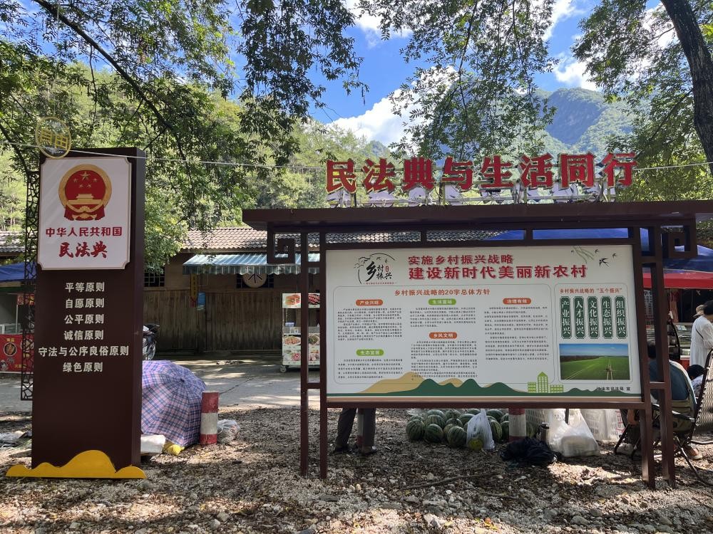 在法治驿站旁打造以“民法典+乡村振兴”为主题的养马峡村法治文化广场,设立室外LED显示屏,用于日常法律服务信息公示、播放法治宣传视频等;设置公共法律服务指引牌、法治宣传栏,张贴“画”说民法典、乡村振兴战略等宣传海报,搭建“法伴一生”民法典主题翻转墙,让游客和村民在休闲趣味中潜移默化地学习法律知识;广场周围设立森林防灭火、消费者权益、优化营商环境等主题宣传牌,深入宣传与养马峡村村民生活密切相关的法律法规,坚持用法治思维引领乡村治理。