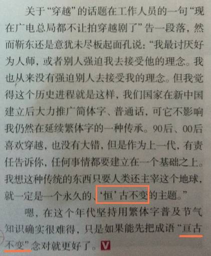 知识渊博的“老干部”喜欢把亘(gèn)古不变读成恒(héng)古不变。