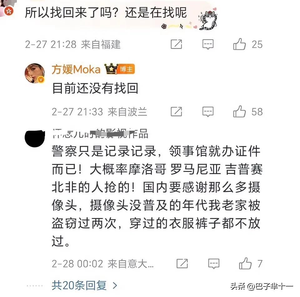 事情发生在2月27日,就在那特殊的一天,@方媛Moka 发文表示:“昨天在米兰遭遇包被抢的事情在网络上引起了广泛关注,感谢大家的关心。” 在大家都在关注着这件事情的同时,相关部门也迅速做出了反应。昨天一早,已即时报警并寻求中国驻米兰大使馆的协助。大使馆的工作人员效率极高,很快给出了明确的答复和有效的措施。这不仅展示了国家在处理此类事件时的迅速和专业,更是展现了祖国的温暖与强大。