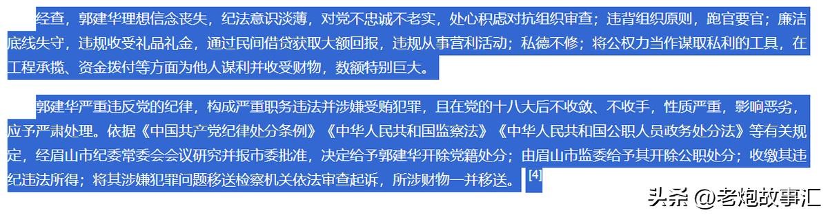 2024年3月22日,郭建华仿佛被毒蛇咬了一口,彻底陷入了贪腐漩涡,被眉山市纪委监委开展纪律审查和监察调查。时至2024年10月30日,他的“罪行”被正式立案审查,经过眉山纪委常委会的研究,这位曾经的高官最终以党籍被开除、职务被免去而结束了他波澜壮阔的官场生涯。