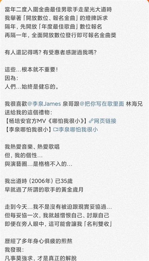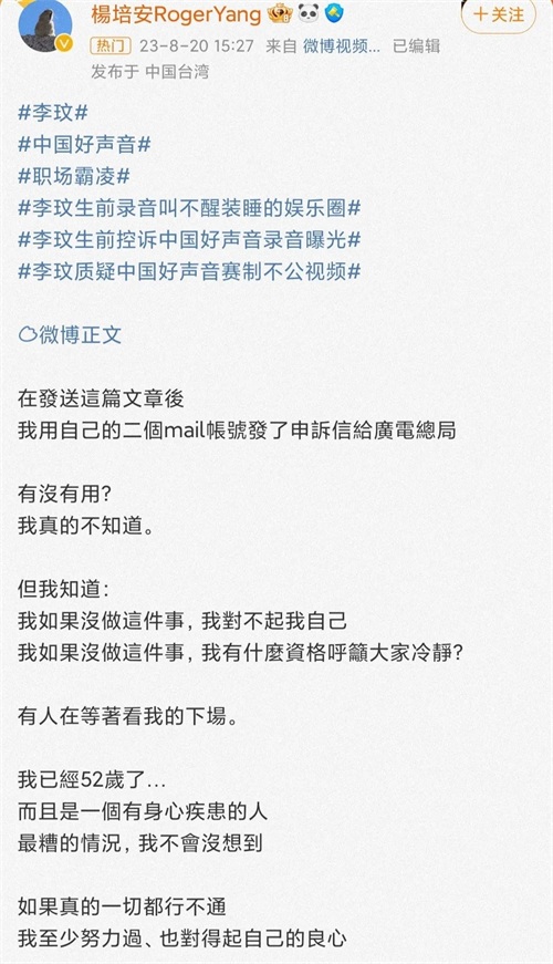 8月20日,杨培安毫不犹豫,火速在社交平台掀开了他的“正义日记”。除了为李玟发声,他更是义无反顾地将申诉信送至广电总局,惹得不少人惊呼:真刚!