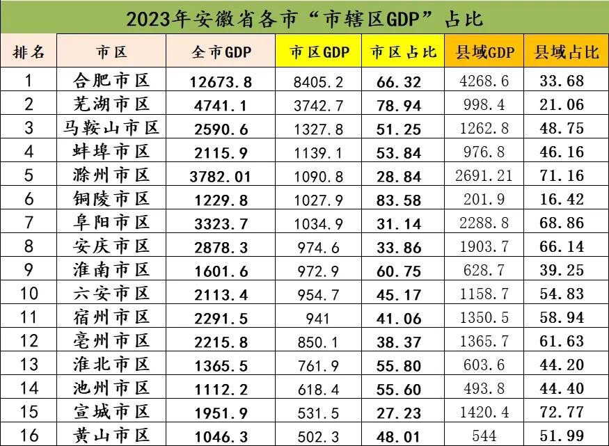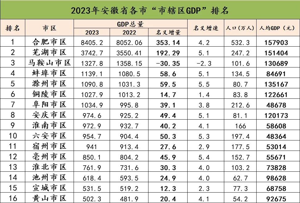 2023年安徽16市“市辖区GDP”排名:马鞍山负增长、蚌埠领先滁州
