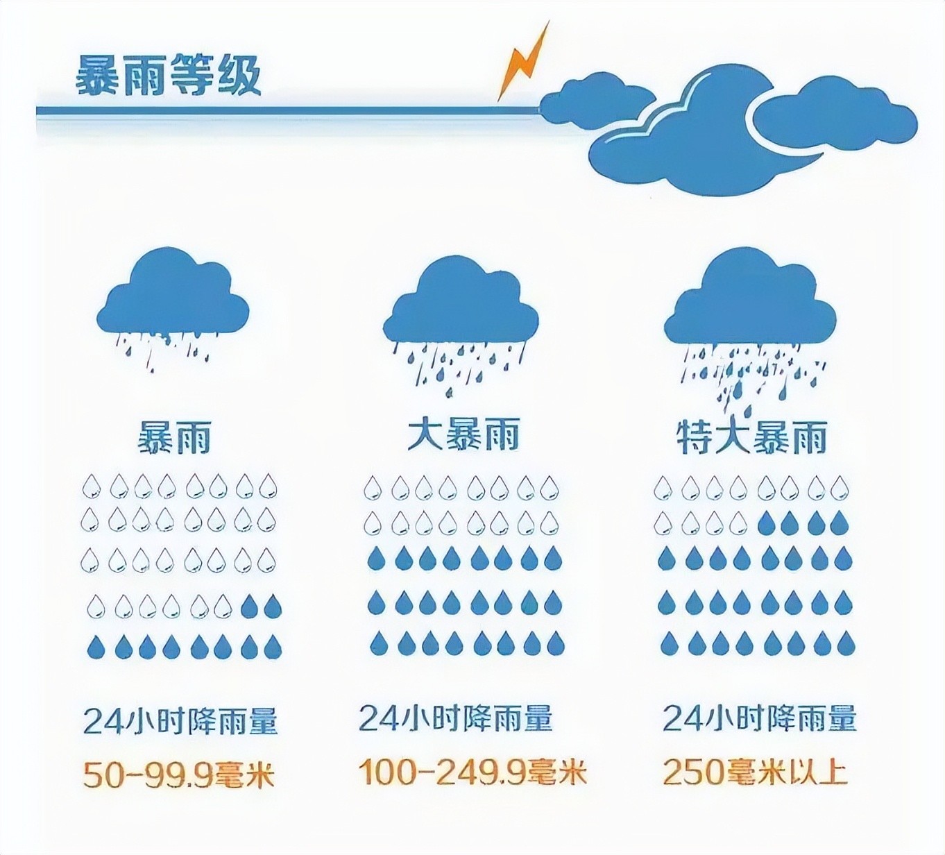 特大暴雨:24小时降水量大于等于250毫米的降水,12小时降水量大于等于140毫米的降水。