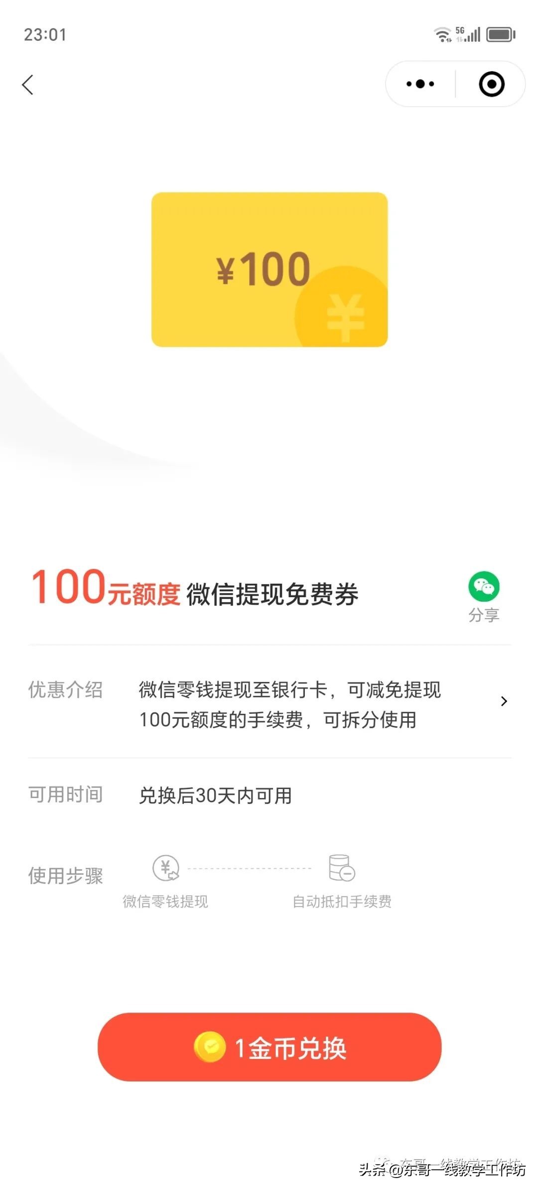 比如说我们点击100元的额度,我们点击一个金币兑换,然后点击一个金币兑换,点击确认兑换,这样的话我们微信支付有优惠就兑换成功了。我们就可以直接进行提现了。