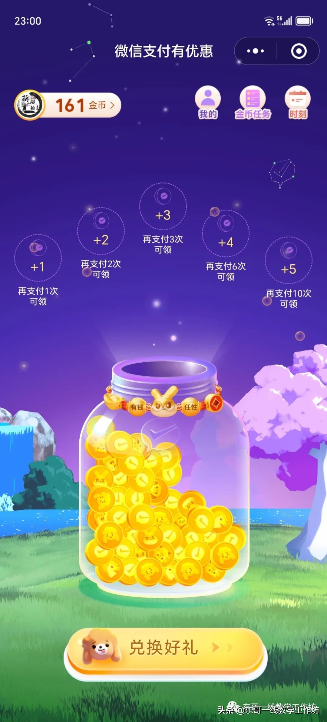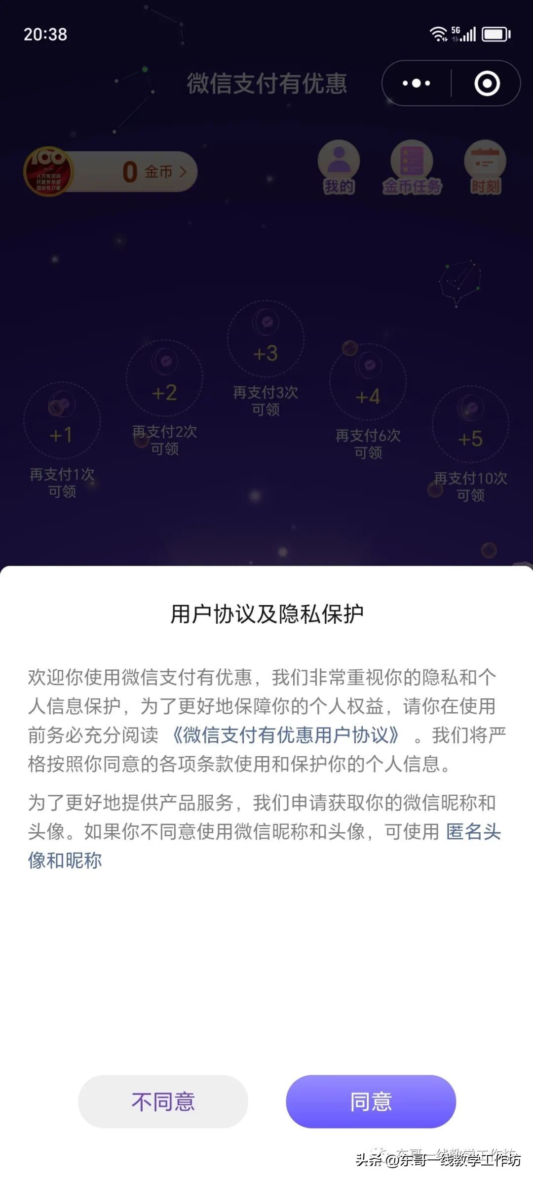 打开微信进去,用微信搜索“支付有优惠”,打开这个小程序,点击同意就可以了,以后使用微信支付就可以获得相应金币了。