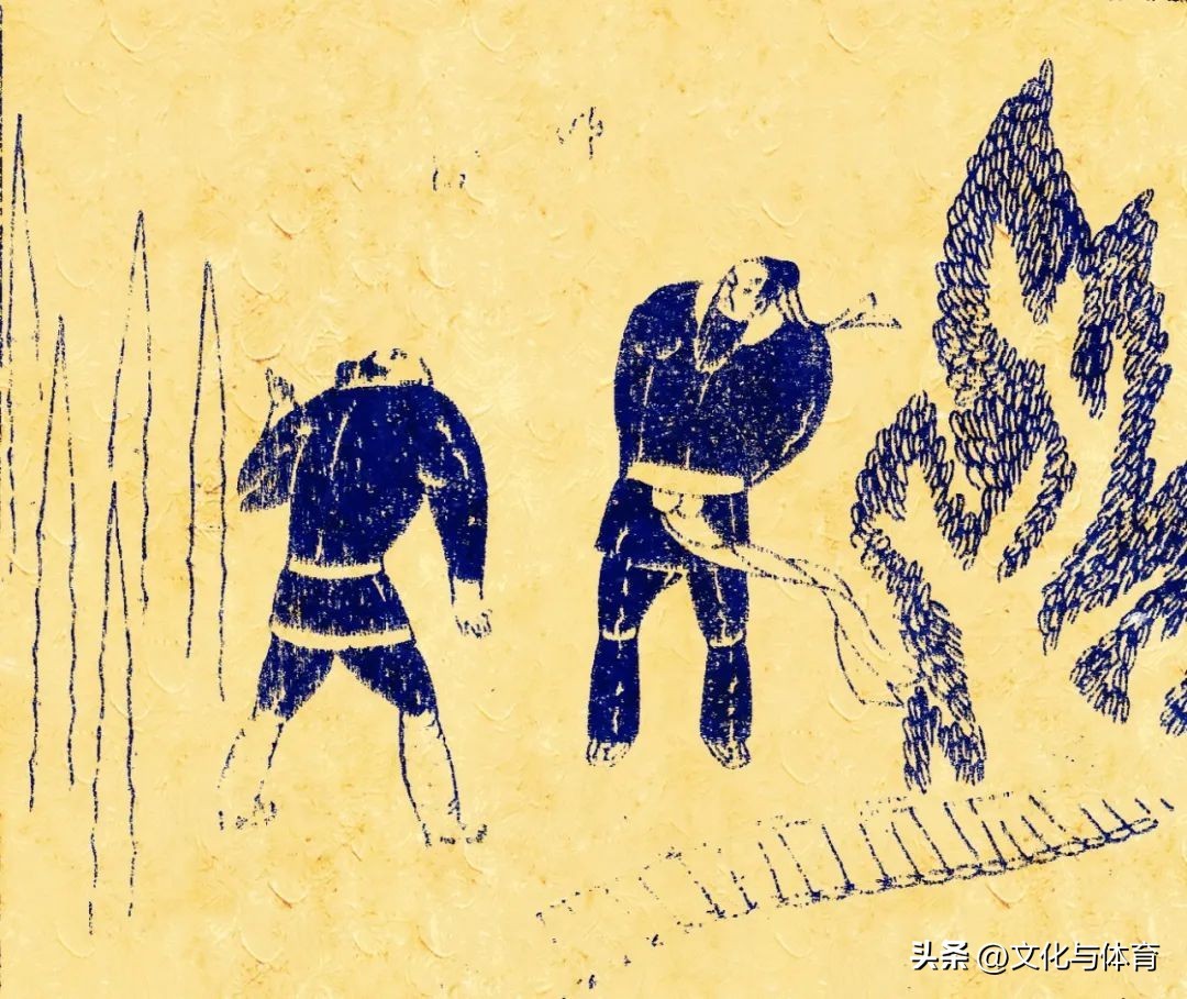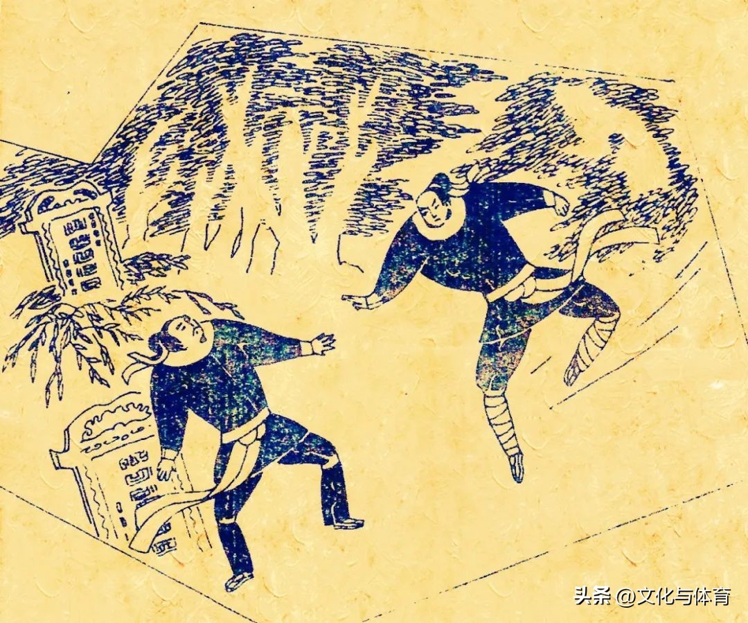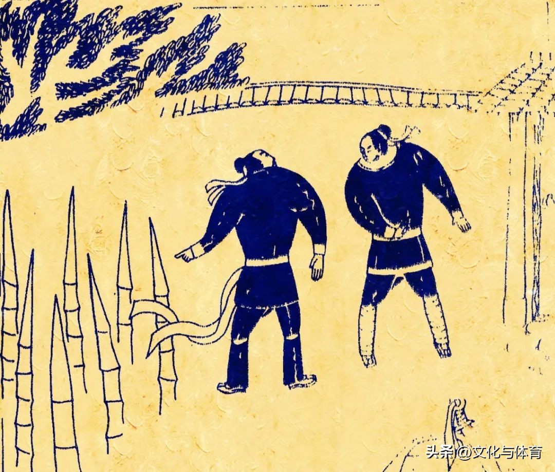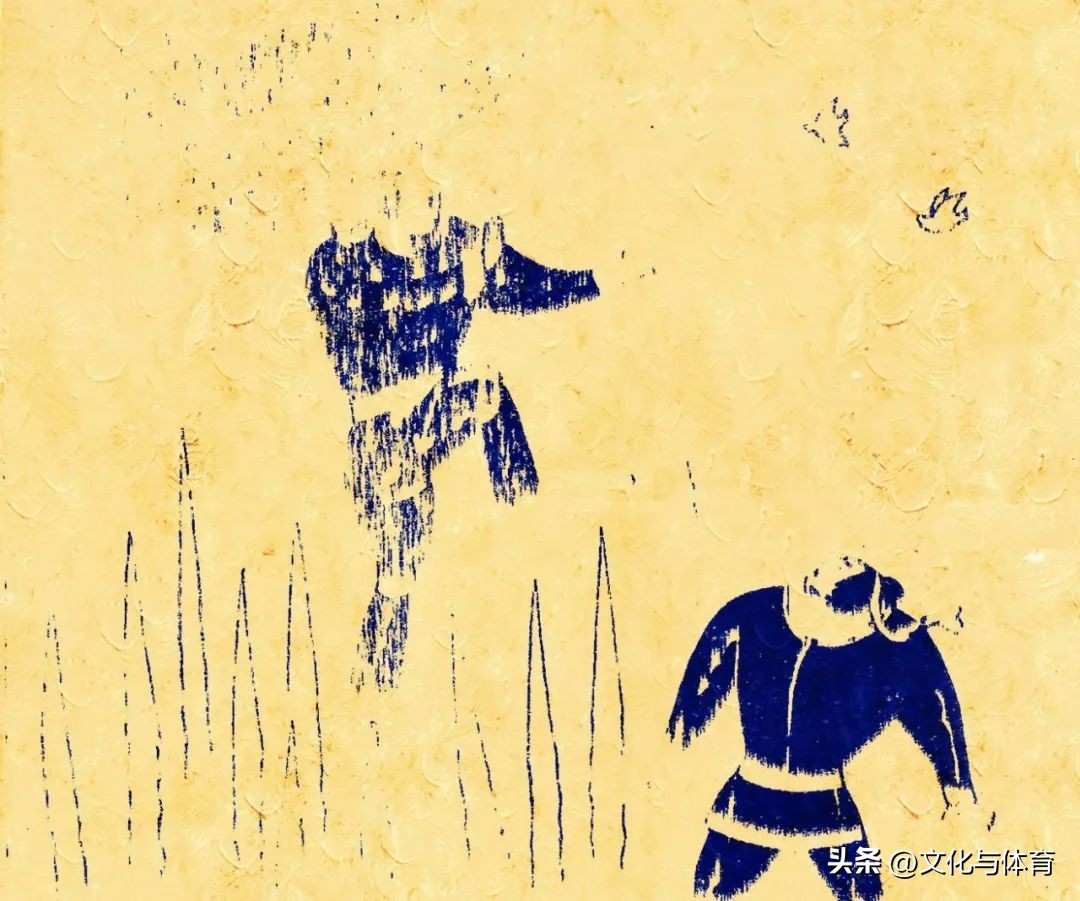 杨班侯飘身下桩,对大汉说:“切磋拳艺,精益求精是咱们武林的传统,为把武术精艺传流下去,我欲传你武技。不知……”黑大汉一听,倒头便拜,连称杨班侯“师傅”。(小橙改编 建国绘画)