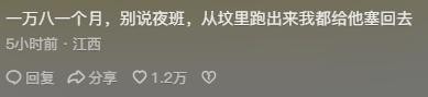 江西网友当时就不乐意了,称要是一万八一个月,别说夜班了,就是从坟里跑出来了,自己都给他塞回去,江西的网友说这句话还是有可信度的。