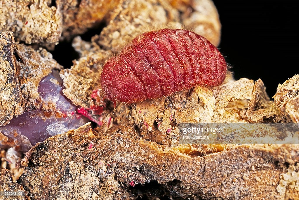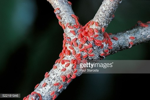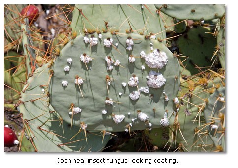 这种胭脂虫原产墨西哥,寄生在仙人掌上,常常聚集一堆,外面有蜡粉和丝状覆盖物。