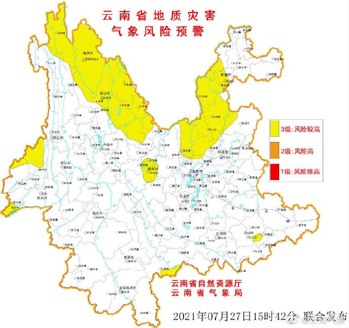 2021年07月27日20:00~07月28日20:00,滇东北昭通市局部、曲靖市局部、滇西北怒江州局部、迪庆州局部、丽江市局部、大理州局部、滇西德宏州局部、滇南普洱市局部、滇东南文山州局部、滇中楚雄州、昆明市发生滑坡泥石流的风险较高。