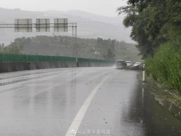 昆楚高速昆明西收费站路段正在大雨,路面湿滑,高速交警来提醒 请驾驶人注意控制车速,保持车距,谨慎驾驶。