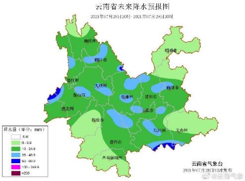 7月28日20时--7月29日20时:迪庆南部、怒江、丽江、大理、保山、德宏、临沧北部、普洱东部、红河、文山南部、楚雄、玉溪、昆明、曲靖南部阴天间多云有中雨局部大雨、暴雨,其它地区多云有阵雨局部中雨。