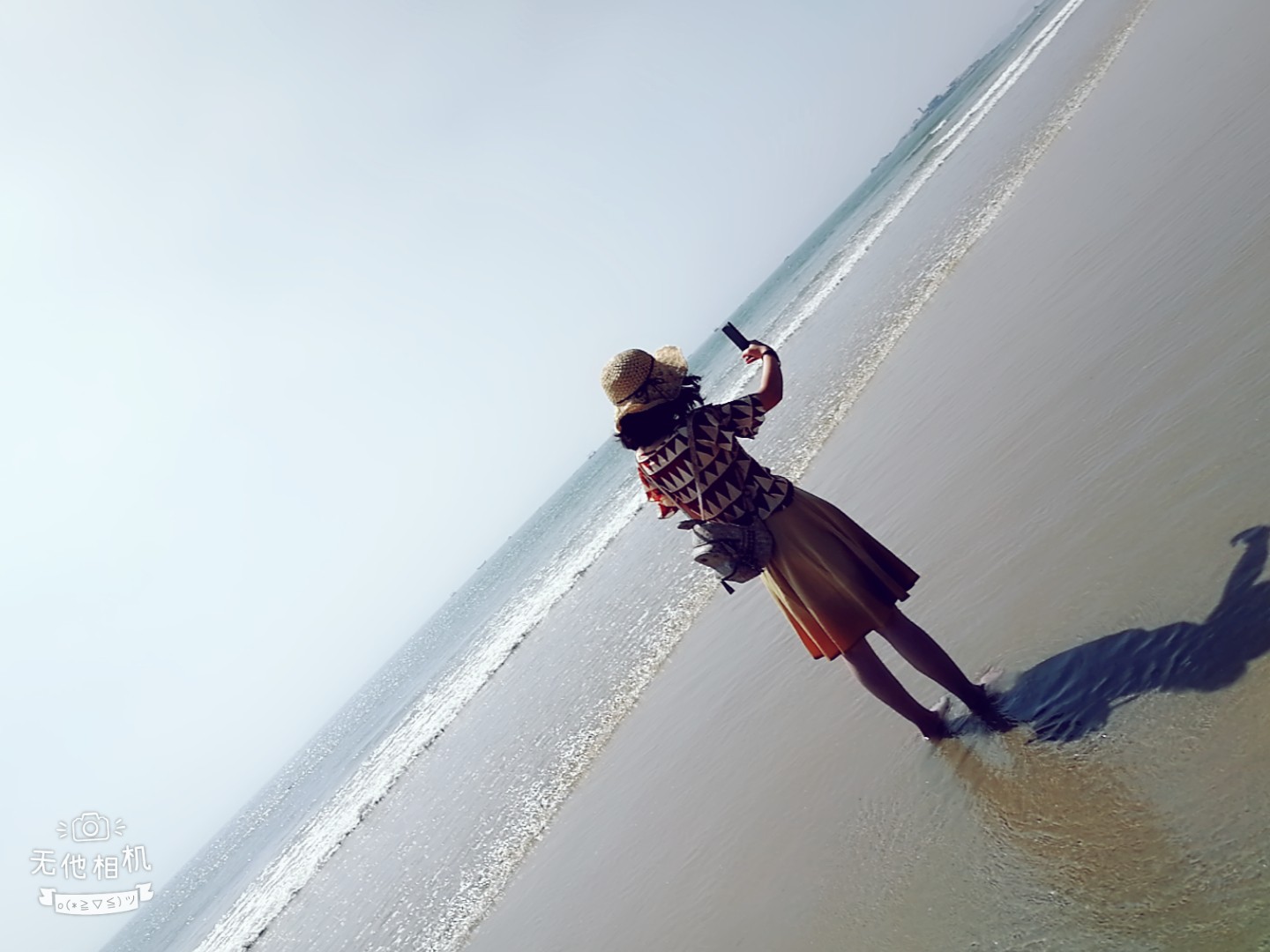 上午沙滩上都没什么人,阳光太强,又恰好被海水反射,刺得人睁不开眼。此时的风景着实差强人意。但好在,我跟小君都属于自寻开心的人。在树枝边尽情的凹造型,反正没人看见,更没人抢镜。又跑到海水里泡脚,享受包场的待遇。