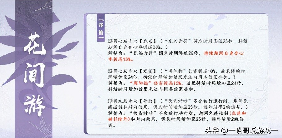 花间:PVP—— 闲垂影移出奇穴,下棋大加强,双乱撒再次被砍,快雪大砍,削春寒影响了正常三毒玩法,删掉了被很多玩家痛恨的西兰花浮花浪蕊。