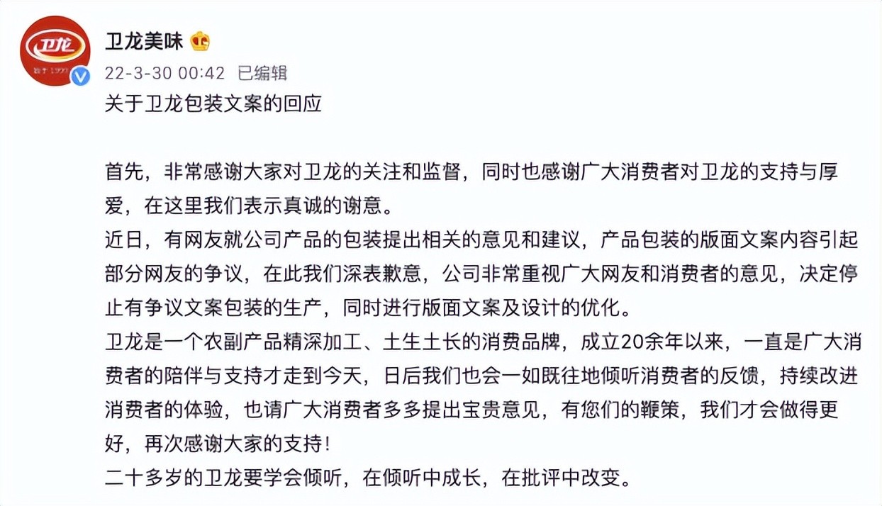 3月30日,“卫龙美味”回应深表歉意,公司非常重视广大网友和消费者的意见,决定停止有争议文案包装的生产,同时进行营销文案及设计的优化。一时间“卫龙致歉”话题登上微博、抖音热搜榜榜首,短时间内总阅读量超过5亿人次,足见其关注度。