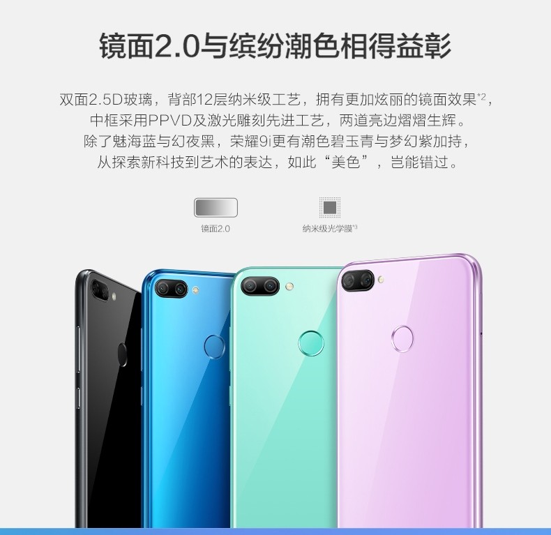 荣耀9i在屏幕设计上采用与荣耀10相同的设计,即“小刘海”加“大下巴”,但荣耀10的“大下巴”是采用了前置指纹技术,而荣耀9i则是加入了logo,毕竟是千元机,在细节上做了相对的取舍。配色上共有碧玉青、梦幻紫、魅海蓝和幻夜黑等四种配色。机身双面均采用2.5D玻璃,背部12层纳米级工艺,拥有更加绚丽的镜面效果,中框采用PPVD及激光雕刻先进工艺,两道亮边熠熠生辉。相对来说颜值很不错。