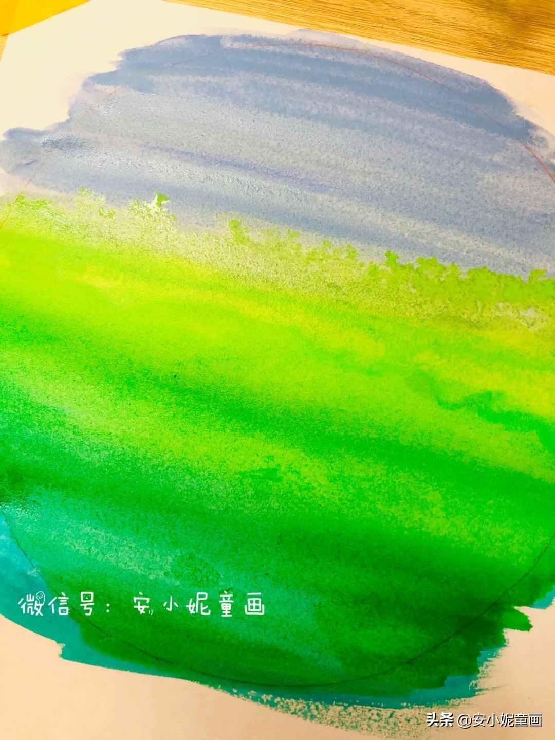 ▼第一步,用深绿色,草绿色,浅蓝色加水成牛奶状用水粉笔依次从下往上刷在圆形上。(8开的素描纸画出10寸大的圆形)