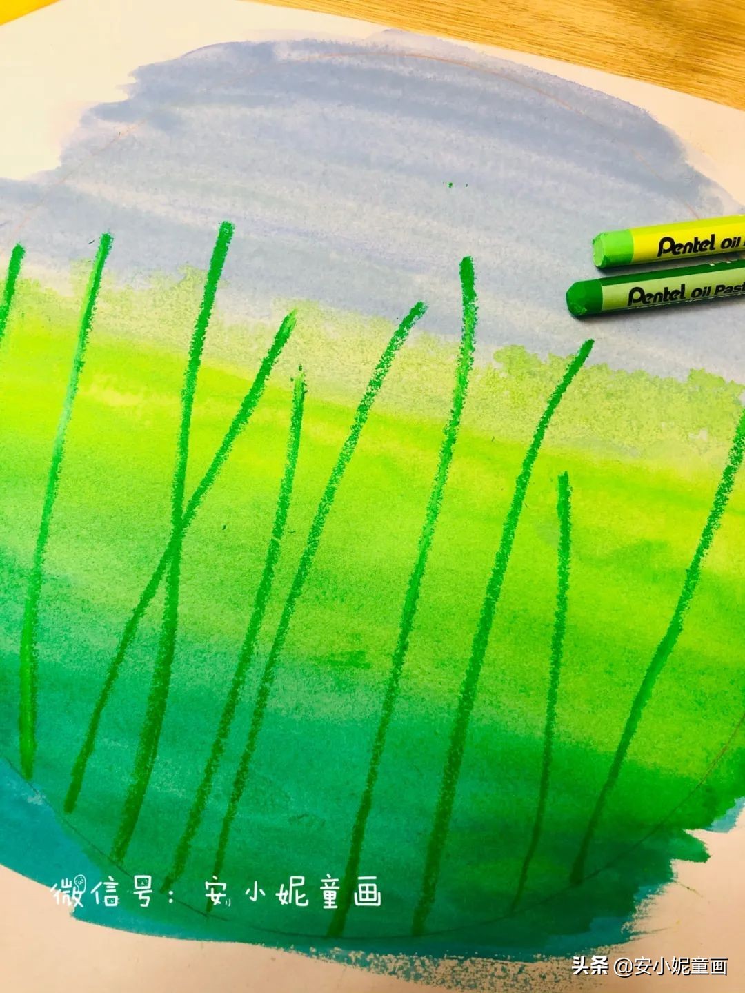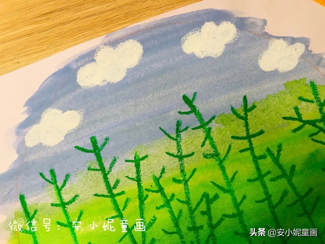 ▼第二步,等画面完全干了后,用翠绿色油画棒(比底色更深的绿色)画出花梗。