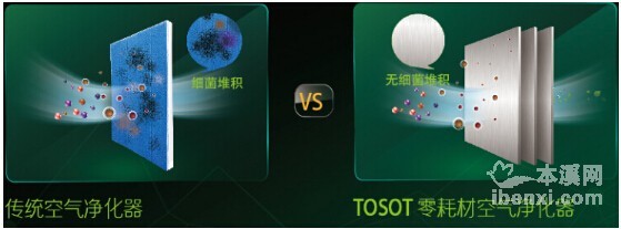那么,究竟TOSOT空气净化器KJFC230A与传统的空气净化器有什么不同呢?记者了解到,传统空气净化器在净化时,会把不能杀灭的细菌吸附在滤网上,长时间积累会造成大量污染物堆积,导致病菌滋生、滤网发霉,而净化器在运作时又会将堆积的污染物带回到空气中,造成“二次污染”。因此,为了保持净化效果,传统空气净化器需要一层HEPA滤网和活性炭滤网。HEPA滤网价格高、寿命短,为了尽量延长其使用寿命,又需要添加一层前置滤网来去除颗粒物。