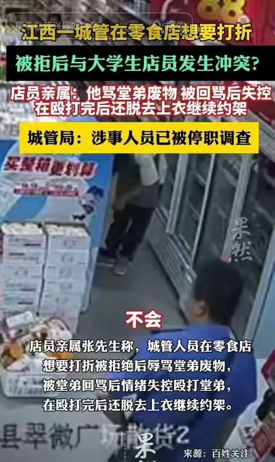 然而,正是这简短的回答,点燃了城管男子的怒火。按照他的说法,之前购买时一直享有优惠,而这次新店员的冷淡态度让他感到不满。在转身离开前,城管男子出口辱骂了店员一句“废物”,导致双方矛盾升级。店员回问了一句“你说什么?”虽未进一步争吵,但城管男子却被这句反问激怒。