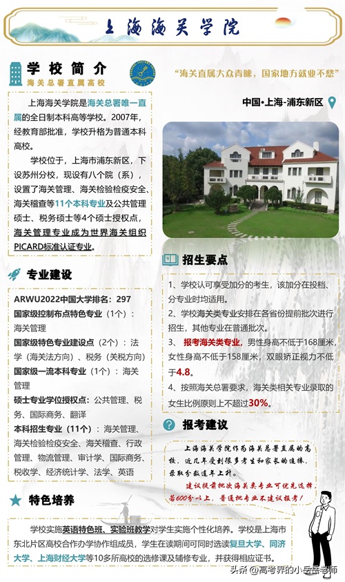 上海海关学院作为国家海关总署直属的唯一一所高校,在国家特殊行业项目人才培养上,有着独一无二的优势,在全国高校的“江湖”地位上,“杀出”另外一条别具一格的路子,也正因此,每年受到很多家长考生的关注,民间有着“五大官校”的俗称。