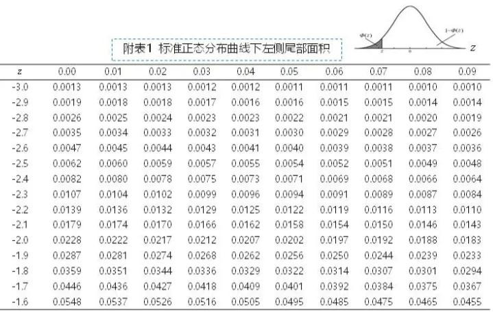实际应用中,经z变换可把求解任意一个正态分布曲线下面积的问题,转化成标准正态分布曲线下相应的面积问题。附表给出了标准正态分布曲线下z值左侧尾部面积,利用标准正态分布可求出原始变量X在任意区间的概率值。