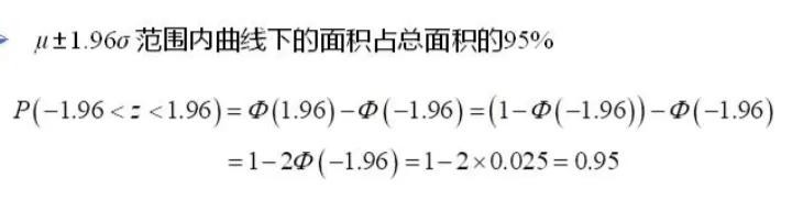 即X的取值在区间μ±1.96σ上的概率为95%。