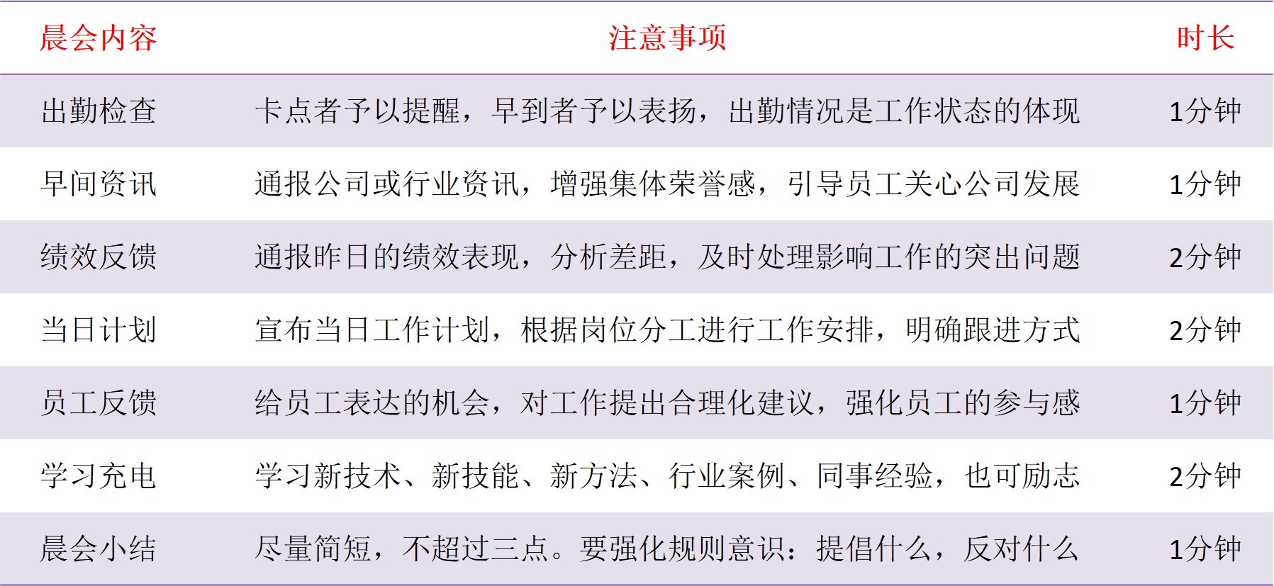 晨会不能流于形式,其内容通常包含出勤检查、早间资讯、绩效反馈、当日计划、员工反馈、学习充电、晨会小结等七个环节。在上述七个环节中,早间资讯和员工反馈往往被忽略。为提升晨会效率,保证晨会效果,本文总结了各个环节的注意事项,并编制了一个表格,以方便大家使用。这个表格不但适用于晨会,也可以作为其它会议的参考。