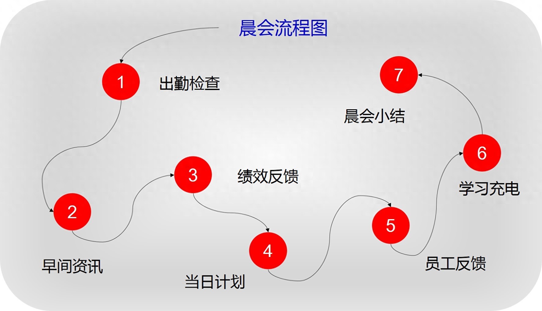 晨会是指利用上班前的5-10分钟时间,全体员工集合一起,互相问候,交流信息,安排工作的一种管理方式。晨会,必须简短,它是统一思想、传播文化、营造氛围、建设团队、树立榜样的有效手段。