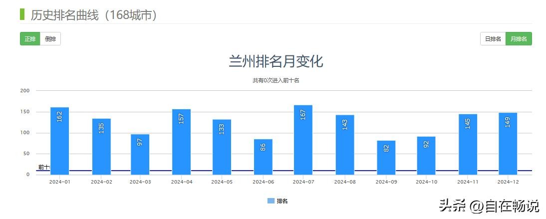虽然兰州空气质量2024年综合排名倒数第一,但是过去的12个月中,兰州没有获得月榜倒数第一,最差排名是2024年7月的倒数第2。