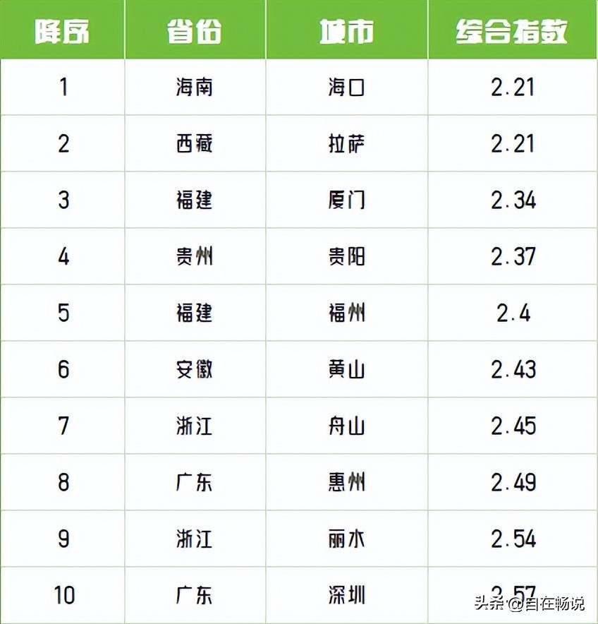 数据显示,2024年全国监测的168个城市中,海南海口与西藏拉萨的综合指数只有2.21,并列第一。
