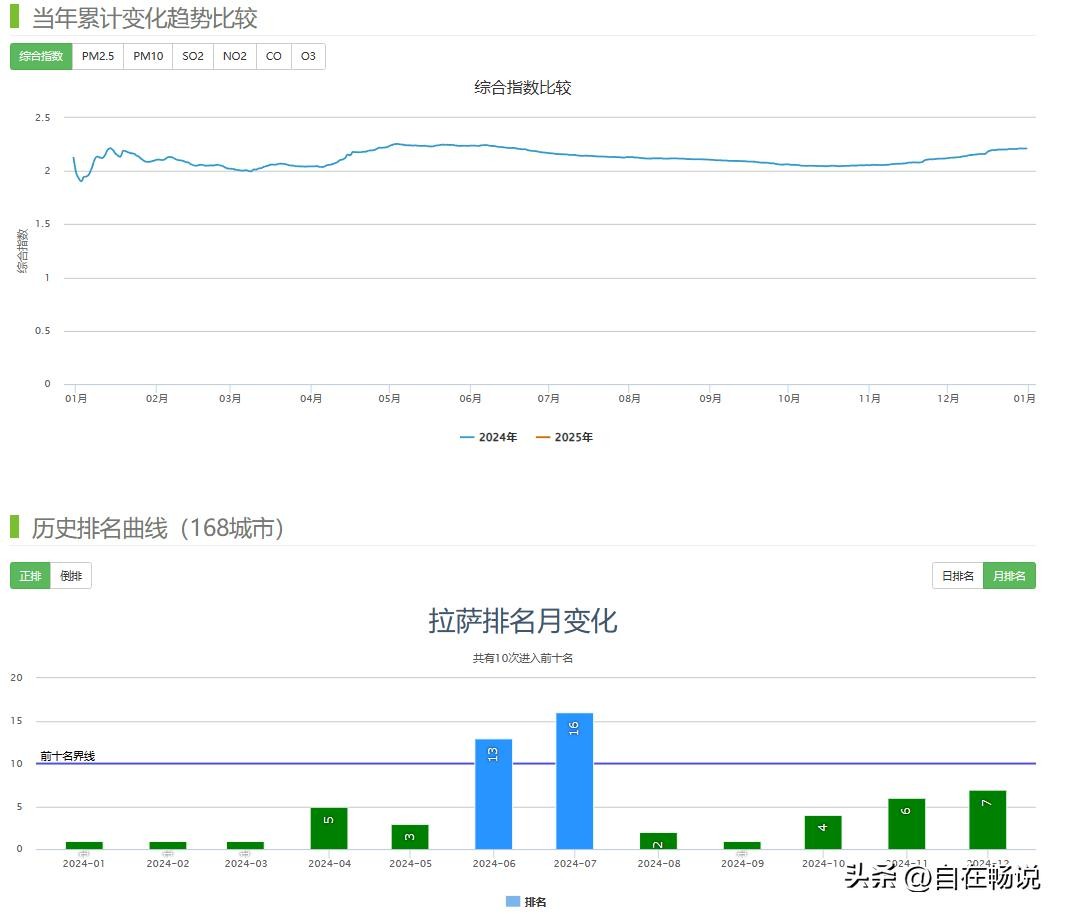 拉萨空气质量最好的月份是1-2月,其中1月、2月、3月和9月,空气质量全部排名国内最好。