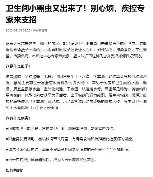 济宁新闻网2020年8月5日《卫生间小黑虫又出来了!别心烦,疾控专家来支招》的报道