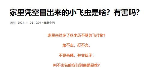 健康中国2021年11月5日《家里凭空冒出来的小飞虫是啥?有害吗?》的报道