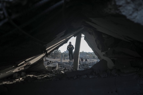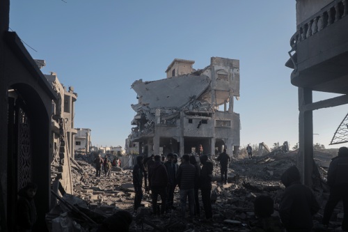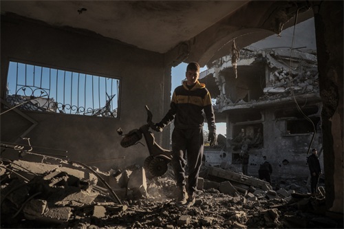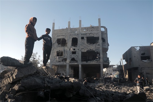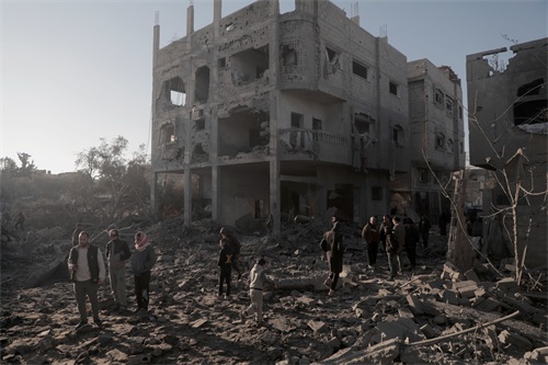 1月3日,在加沙地带中部迈加齐难民营,当地民众查看被以军袭击毁坏的房屋。新华社发(里泽克·阿卜杜勒贾瓦德 摄)