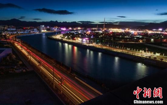 夜幕下狮泉河穿城而过,两岸灯火通明。