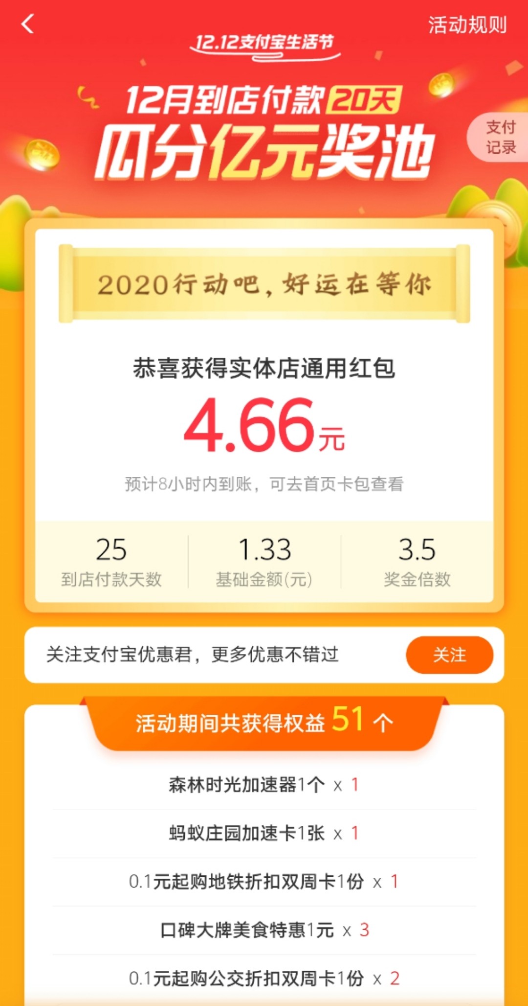 支付宝12月到店付款发红包了,看大家分了多少钱?
