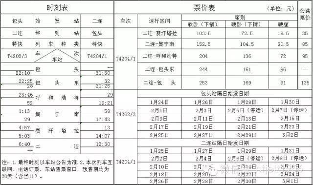 二连浩特至包头自1月25日起至2月6日止、2月10日起至3月3日止,隔日加开T4204/1次,全程运行时间为9小时20分。