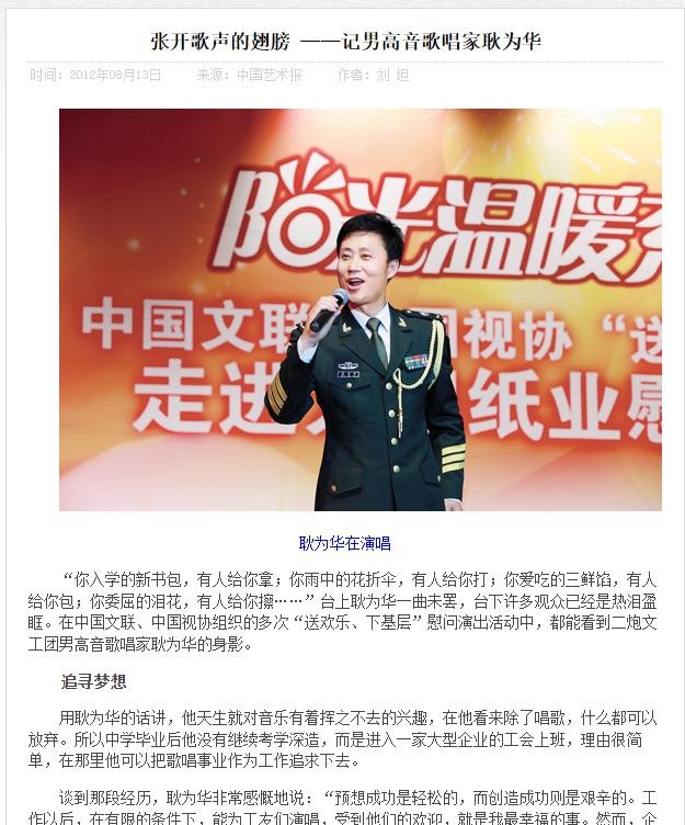 中国艺术报 2012年8月13日 关于《张开歌声的翅膀 ——记男高音歌唱家耿为华》的报道